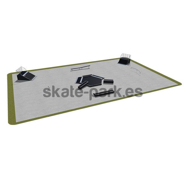 Bank ramp, Platform + 2x grindbox + grindrail, Quarter pipe, Grindbench 1, Pole jam, Grindbox 9, Grindrail „C”