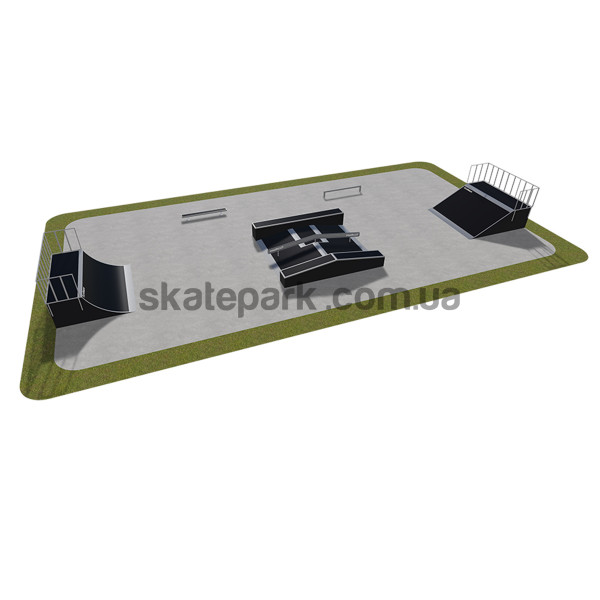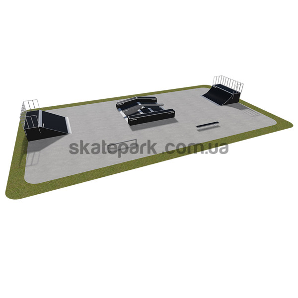 Bank ramp, Grindrail, Funbox + Grindbox 3/3 + grindrail 2/3, Grindbench 1, Quarter pipe