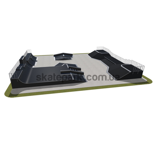 Set bank ramp + grindbox, Platform + quarter pipe + grindbox + stairs + grindrail 2/3 + grindbox 2/3 + funbox phyramid 1, Wall ride, Quarter pipe + mini quarter pipe
