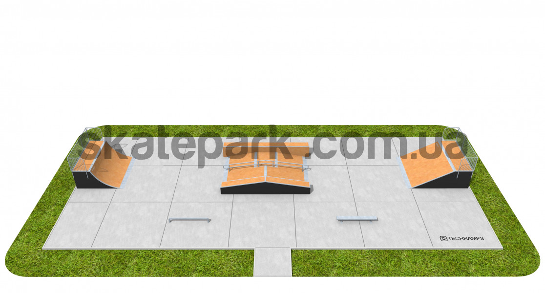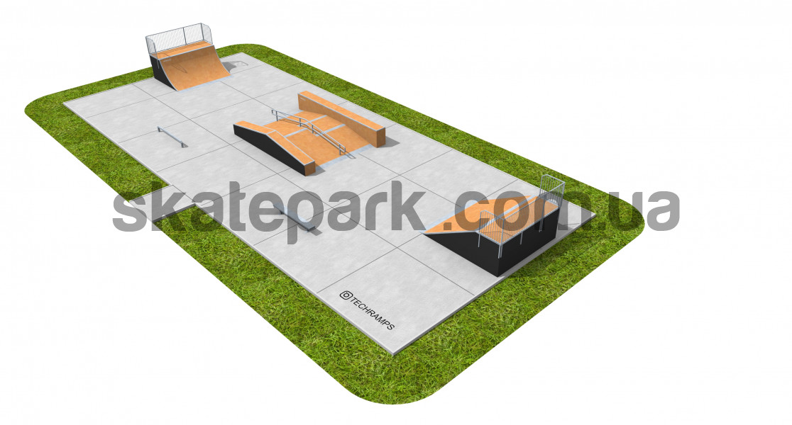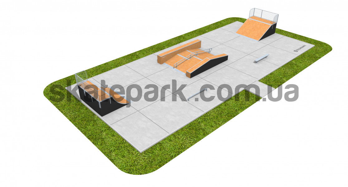 - Quarter Pipe - Funbox з гриндбоксом + поручні + простий гриндбокс - Bank Ramp - Лава 1 - Невеликий прямий поручень - профіль