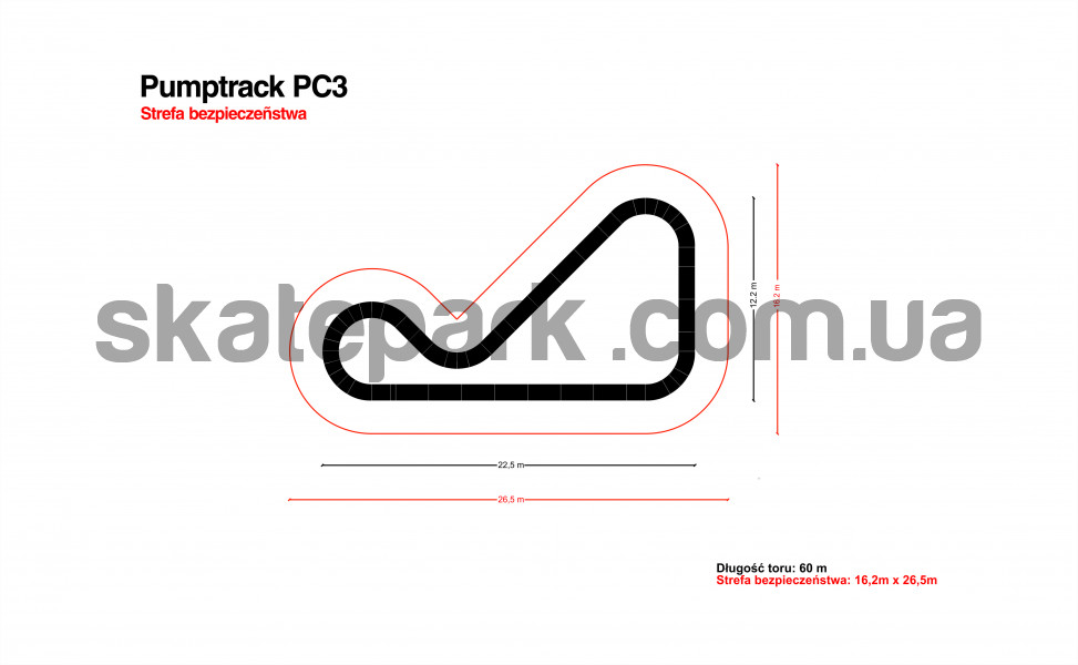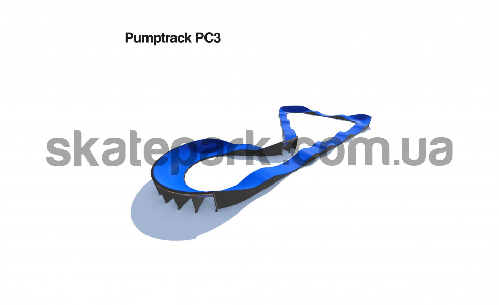 Композитний памп-трек PC3 складається з 4 поворотів і 11 купин для розгону, завдяки чому користування цією трасою стає більш цікавим і привабливим для користувача. Памп-трек PC3 з комерційної пропозиції задовольнить потреби початківців, а також осіб, знайомих з цією спортивною дисципліною.