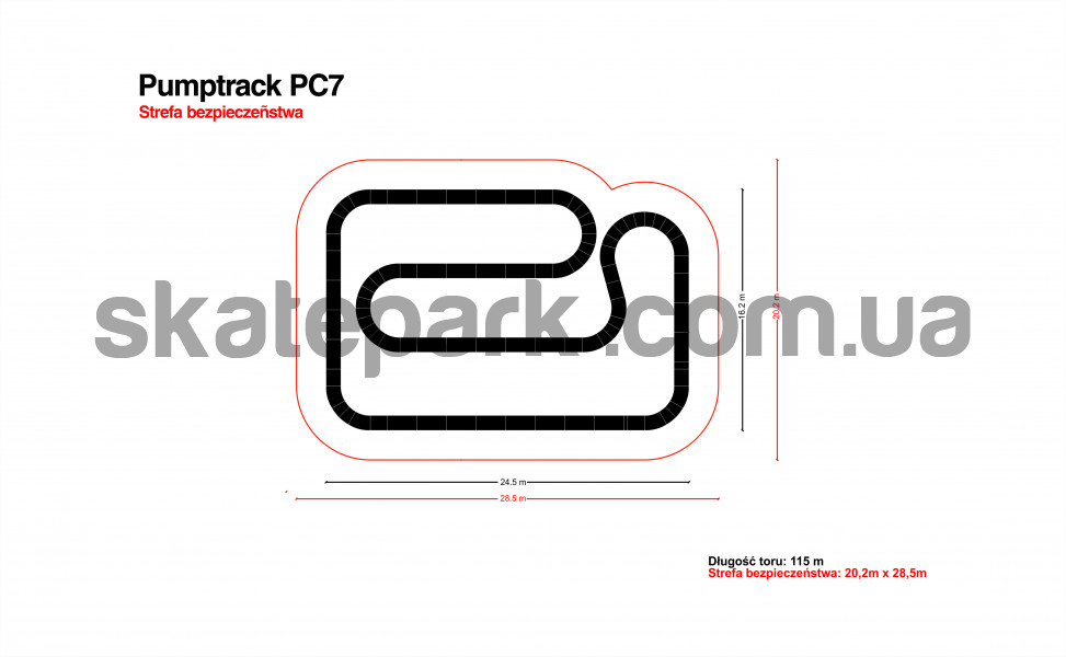 Композитний памп-трек PC7 це комбінація з 23 купин для розгону і 7 смуг з різними кутами повороту. Така комбінація дозволить всім користувачам, як початківцям, так і професіоналам, розвивати свої уміння, а завдяки своїй різнорідності памп-трек цього типу ніколи не набридне.
