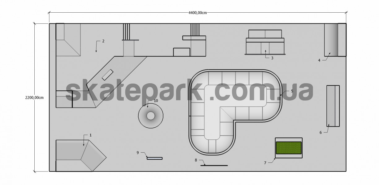Bank ramp, Platforma, Funbox z grindboxem+ poręcz + grindbox 5, Quarter pipe, Bowl, Grindbox - trapez, Grindbox , Poręcz prosta – profil [], Ławka 1, Wulkan