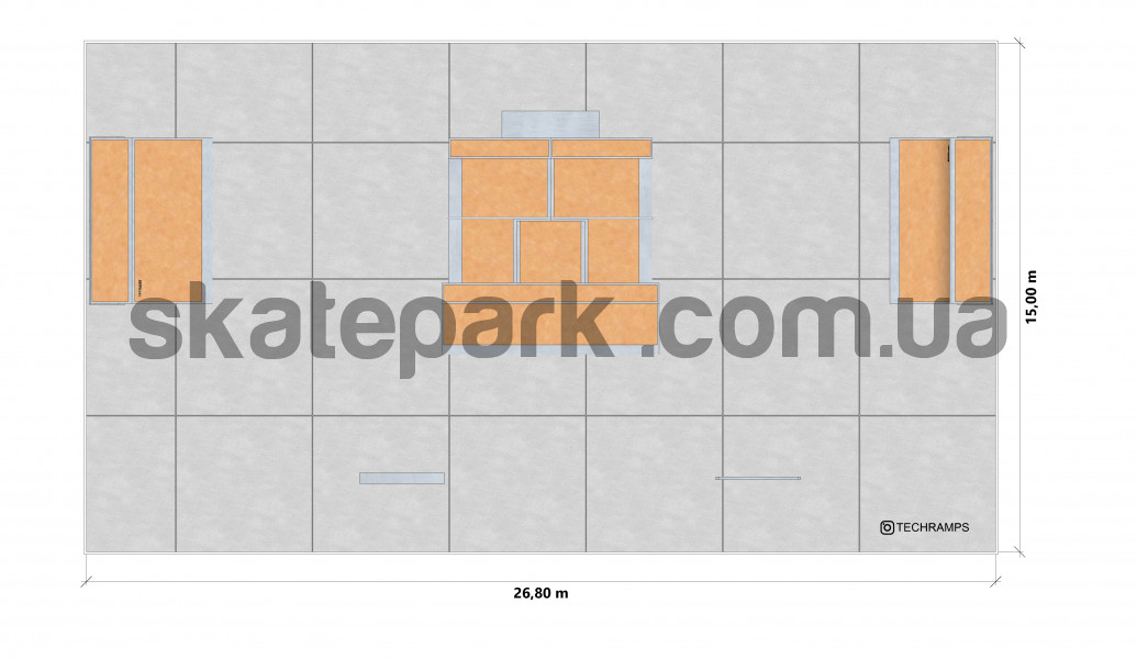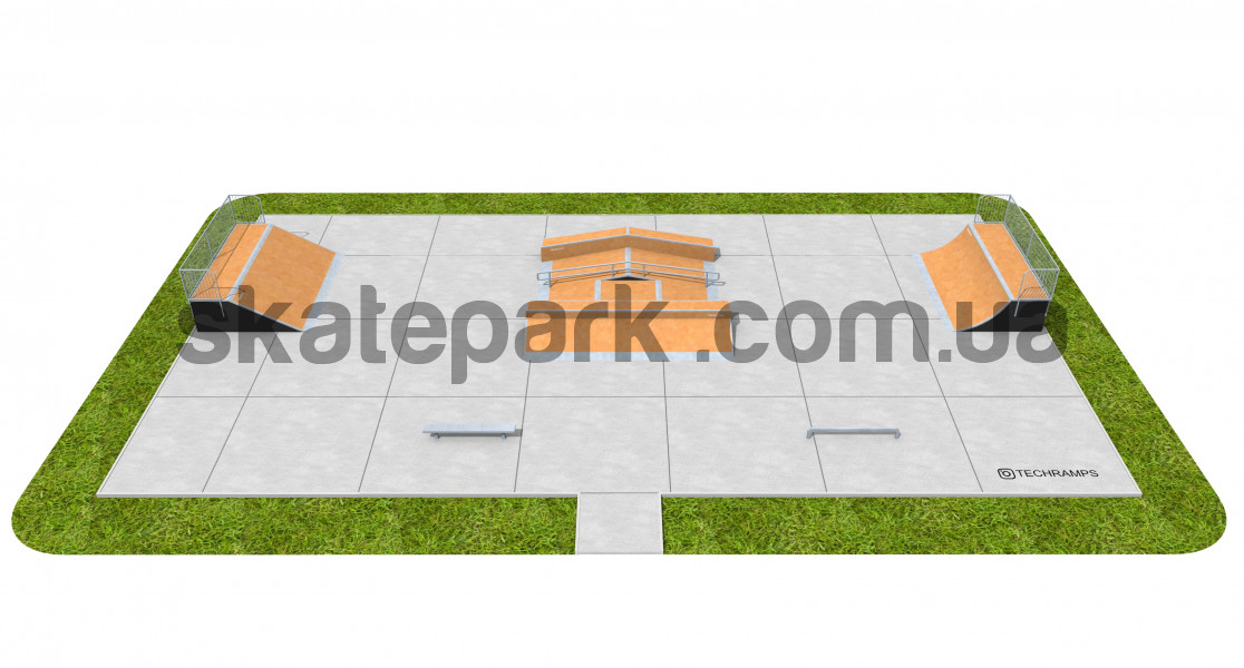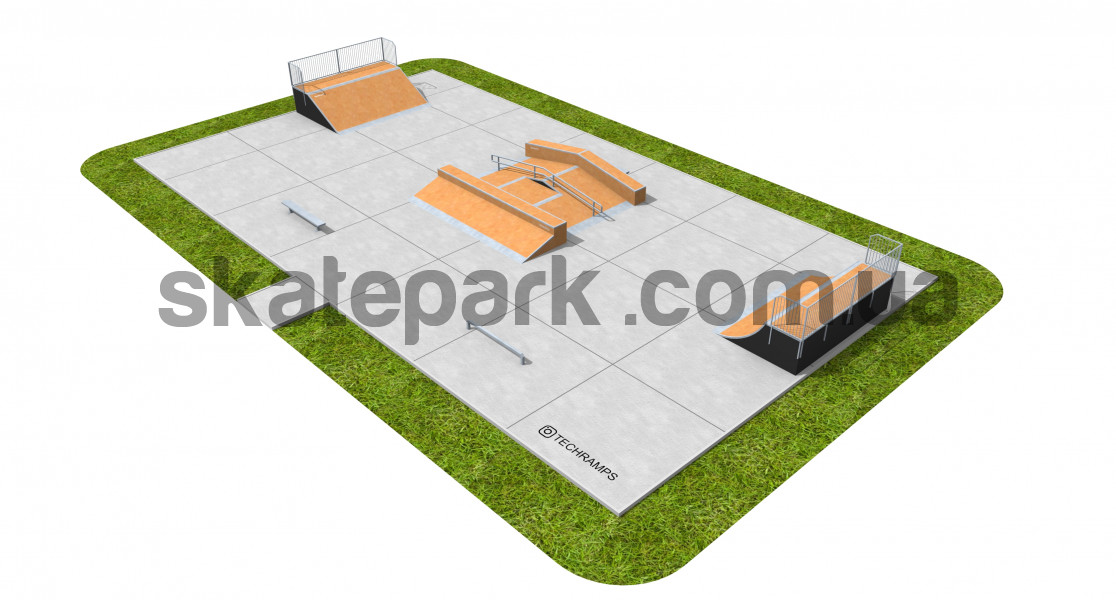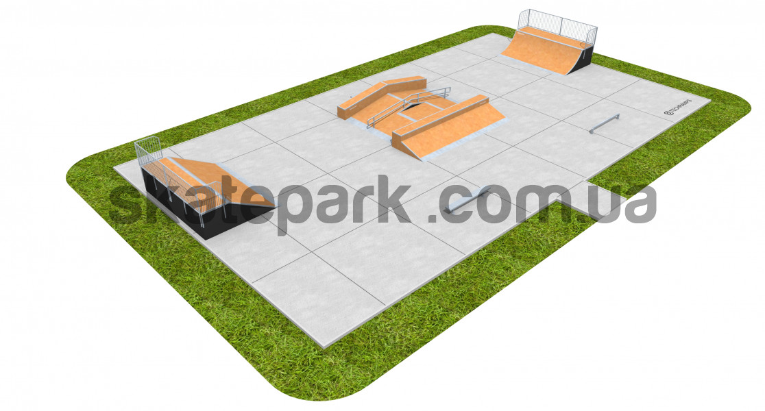 Відкритий модульний скейтпарк - Банкова рампа - Чверть труби - Фанбокс з подвійним гриндбоксом + перила + лавка - Лава 1