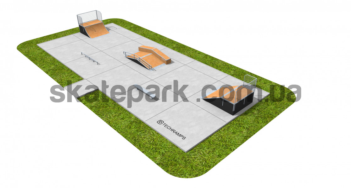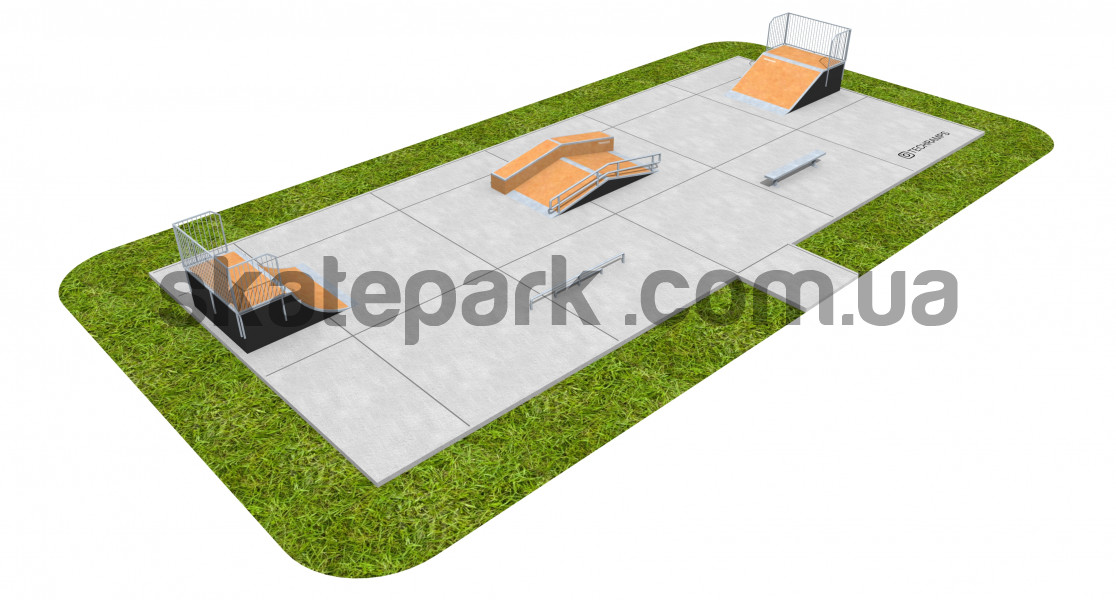 Відкритий модульний скейтпарк: - Quarter Pipe - Funbox з гриндбоксом + поручні - Bank Ramp - Лава 1 - Прямий поручень