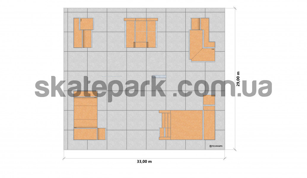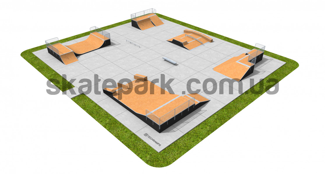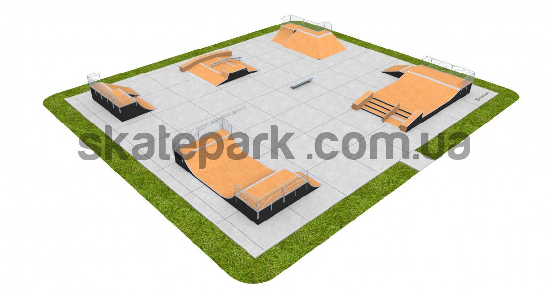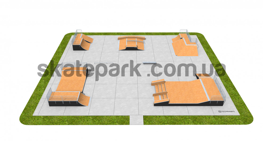 - Quarter Pipe + Bank Ramp - Funbox з грайндбоксом 3/3 + перила 2/3 + грайндбокс 3/1 - 2x Bank Ramp 90 st піраміда + Quarter Pipe - Прямий поручень - Лава 4 - Міні-рампа H120 + чверть труби - Платформа + Банкова рампа