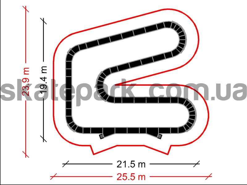 Довжина доріжки: 95м Площа для установки: 23,9м х 25,5м Вага: 3450 кг Доступні кольори: чорний, синій, червоний, зелений, жовтий