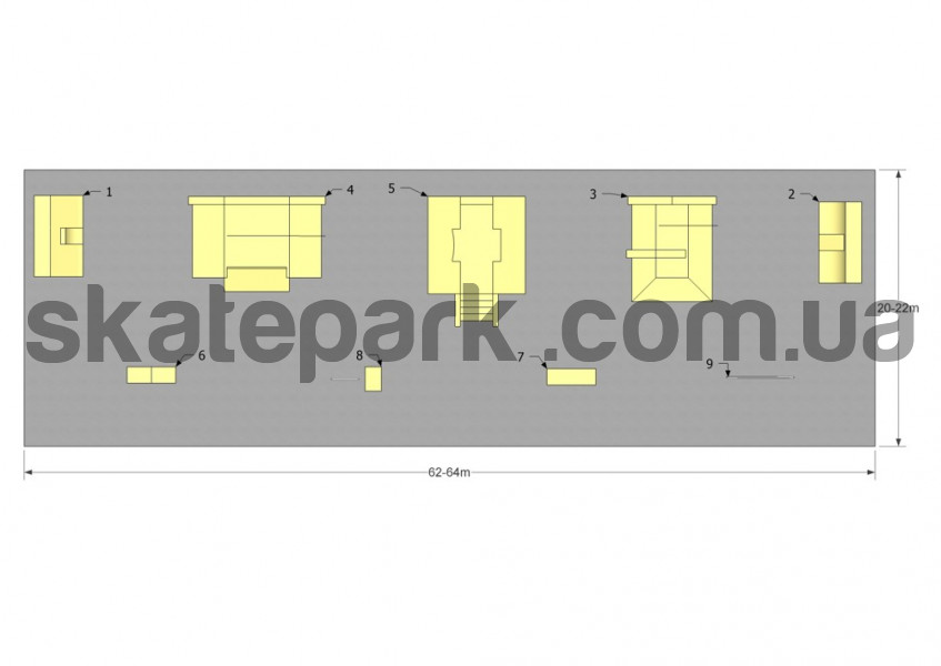 Bank z quarterem, Quarter z bankiem, Funbox h45, Funbox h60, Bank ze schodami, Grindbox, Grindbox, Skocznia z barierką, Poręcz prosta