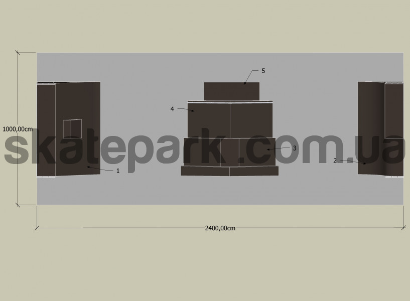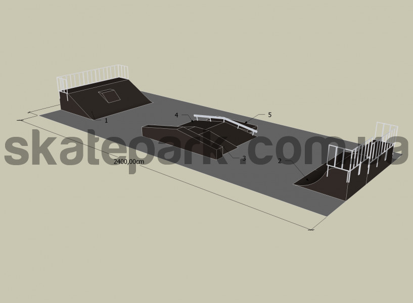 Bank ramp + mini quarter, Quarter pipe + roll-in, Funbox z disaster boxem, Funbox z poręczą, Grindbox 1