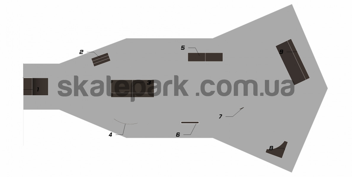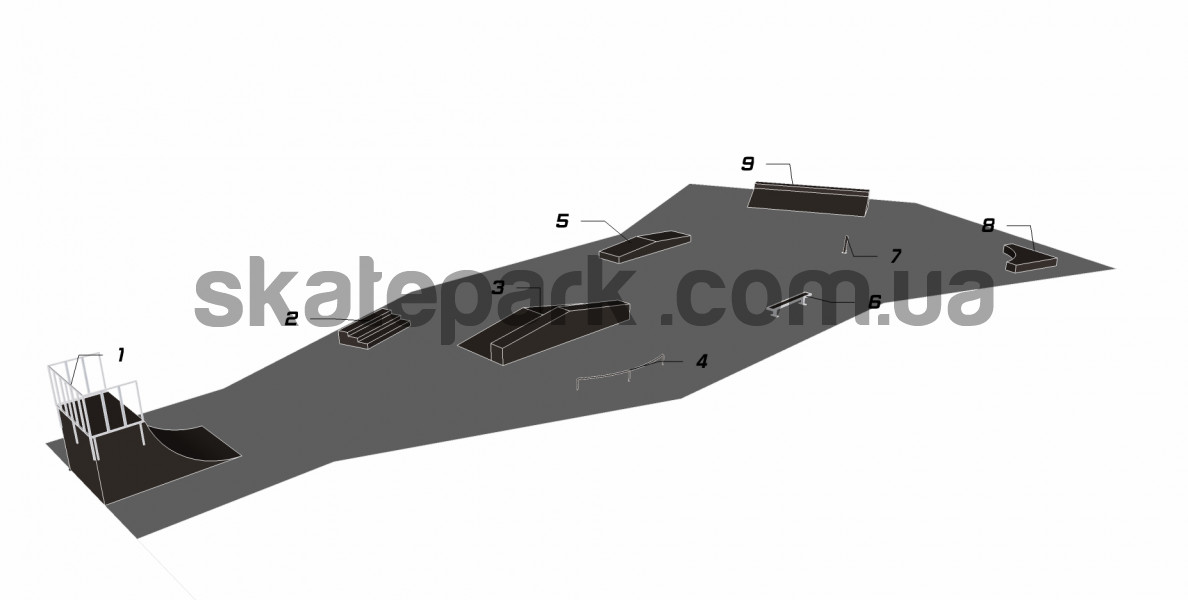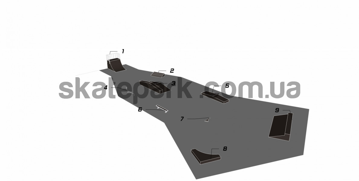 Quarter pipe, Grindbox 8, Funbox z grindboxem, Poręcz ”C”, Grindbox 5, Ławka 1, Poll jam , Grindbox 6, Grindbox 12