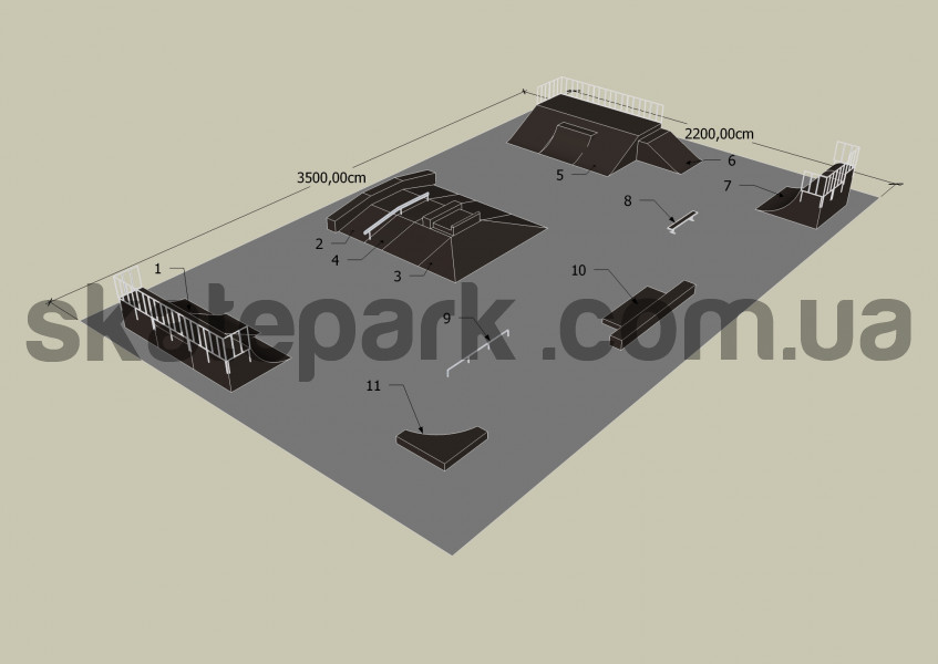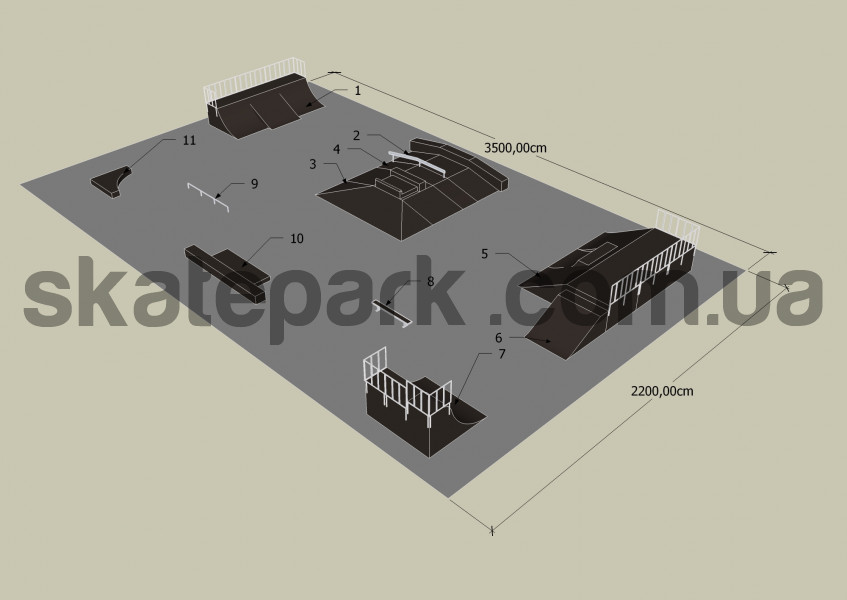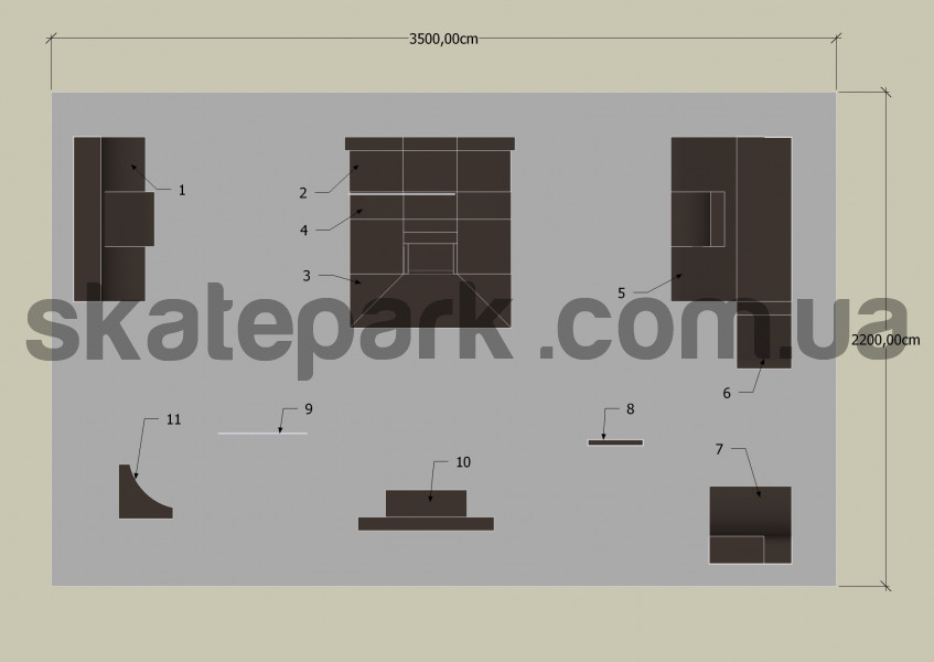 Bank Ramp, Quarter Pipe, Funbox z grindboxem 2/3, Funbox with rail 2/3, Grindbox 2, Grindbox 1, Grand Benach 1, Flat rail
