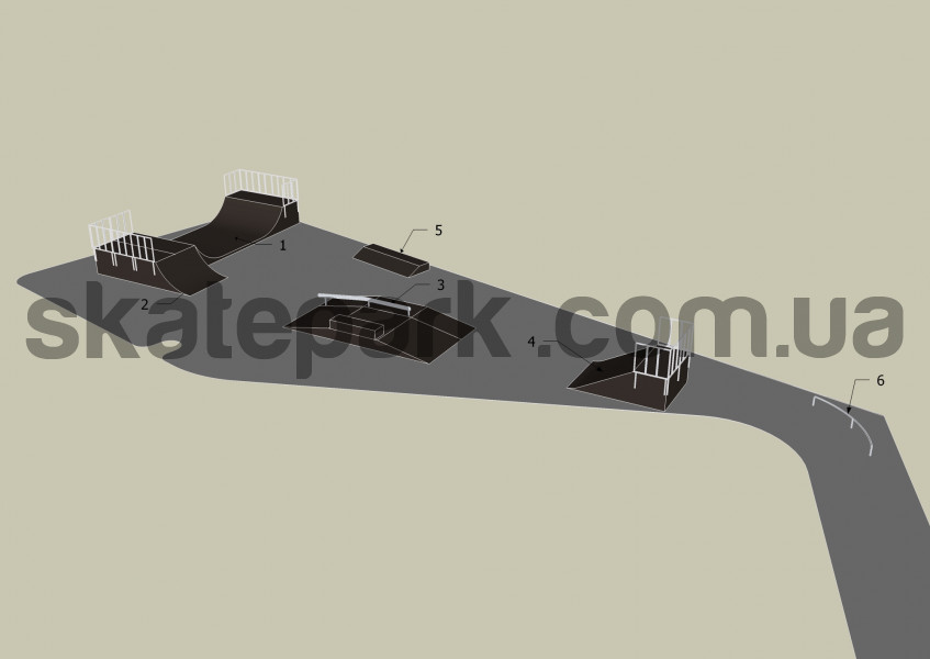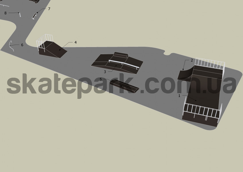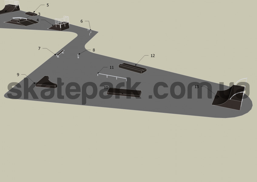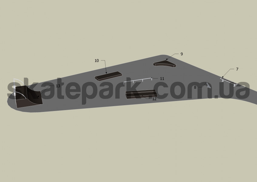 Minirampa H120, Quarter pipe, Funbox z grindboxem 3/1 + poręcz 2/3, Bank ramp, Grindbox 9, Poręcz „C” – profil O, Ławka 1, Poll jam, Grindbox 6, Grindbox 1, Poręcz prosta – profil O, Grindbox 7, Quarter pipe