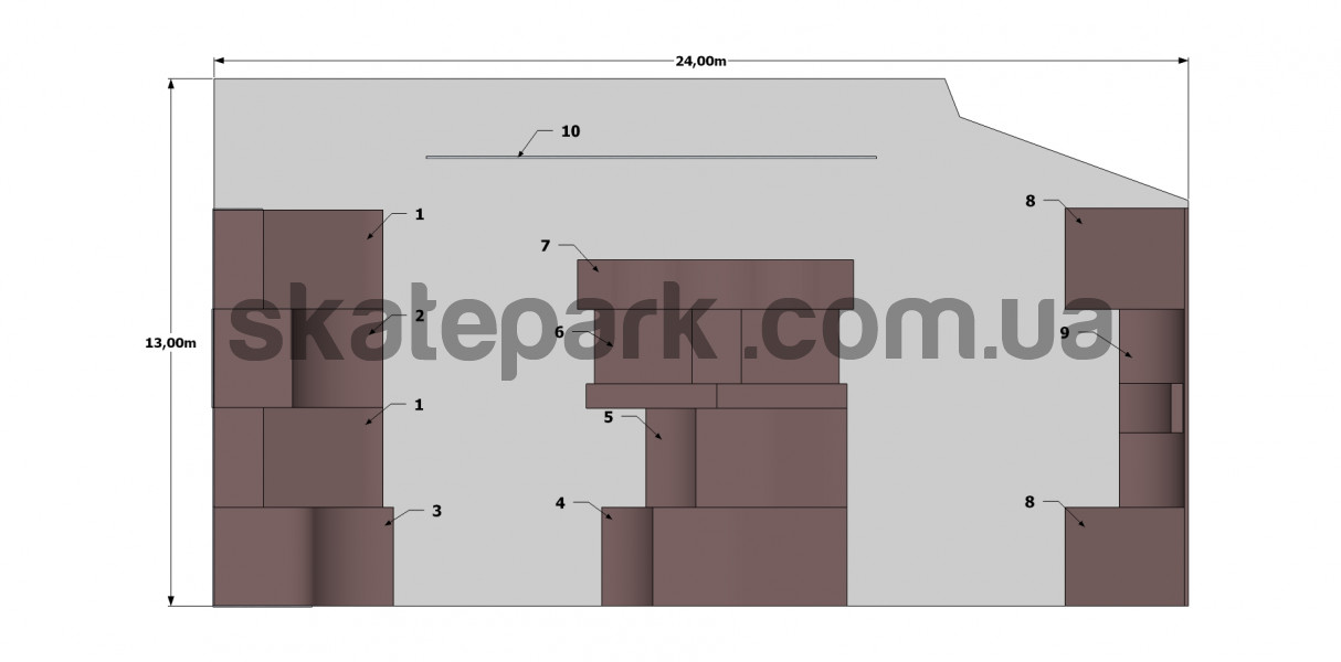Bank ramp , Quarter pipe , Rall-in, Funbox do skoków, Funbox do skoków, Funbox z disater boxem, Fala, Bank ramp + wal ride, Quarter pipe + mini quarter, Poręcz prosta