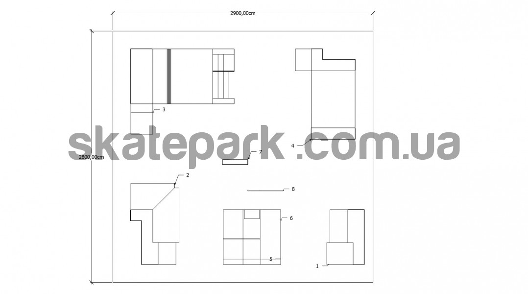 Quarter Pipe + Bank ramp, Bank Ramp Piramida + Quarter Pipe, Platforma z murkami, poręczą i London gap’em, Minirampa +Quarter Pipe, Funbox z grindboxem 3/3, Funbox z poręczą i grindboxem 3/1, Grindbox „ławka z oparciem”, Poręcz prosta