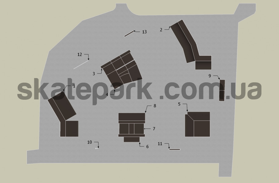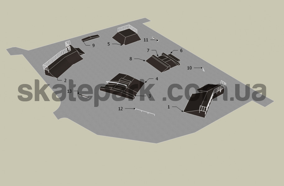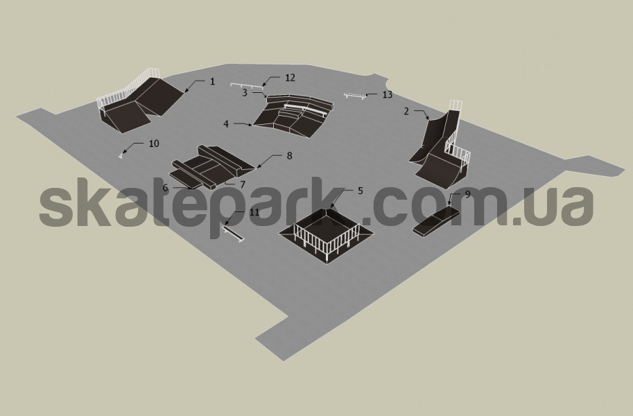 2x Bank ramp 30st, Quarter pipe, Funbox z grindboxem 3/3 + poręcz 2/3, Funbox z grindboxem 3/1, 2x Bank ramp 90st piramida, Grindbox 1 + grindbox 2, Funbox (podest 122), Grindbox 12, Grindbox 5, Poll jam, Ławka 1, Poręcz prosta, Ławka 1,