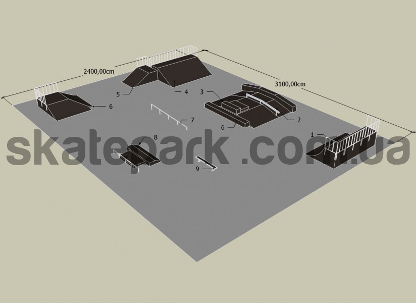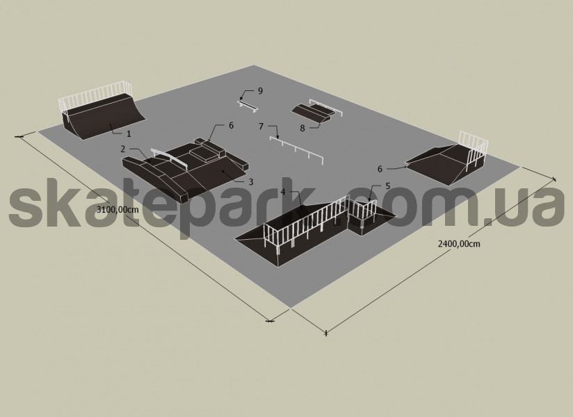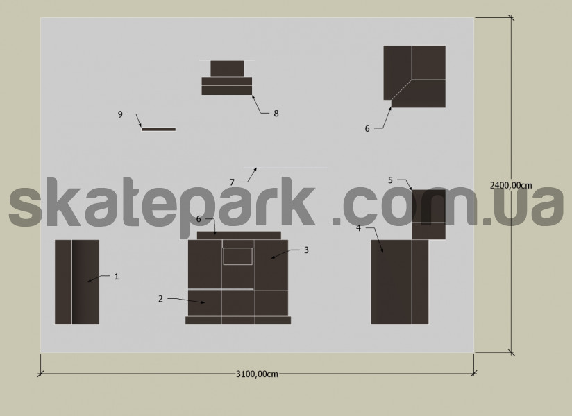 Quarter pipe, Funbox with grindboxem 3/3, Funbox with rail 2/3, + manualbox + grindbox 3/1, Bank ramp, Bank ramp, 2x Bank ramp 90st piramida, Rail - profile O, Grindbox 9 + Grindbox 1, + flat rail –profile [], Grind bench 1