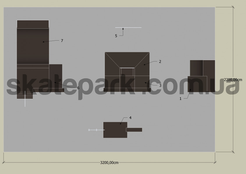 Quarter pipe + Bank ramp, Funbox piramida 2 z poręczą 3/1 +grindbox 1, Funbox z grindboxem 3/3, Grindbox 10, Poręcz prosta – profil O, Platforma, Minirampa H100