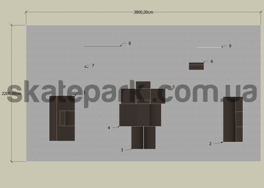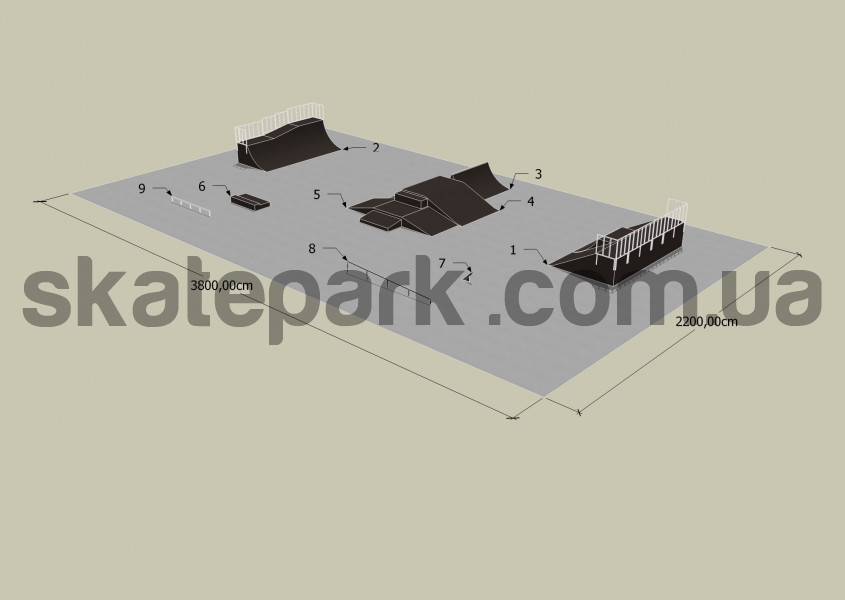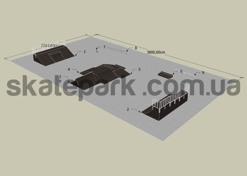 Bank Ramp z quarterem, Quarter Pipe, Spin ramp, Funbox do skoków, Funbox z grindboxem 1/3 + grindbox, Grindbox 7, Poll jam, Poręcz spadowa, Poręcz prosta
