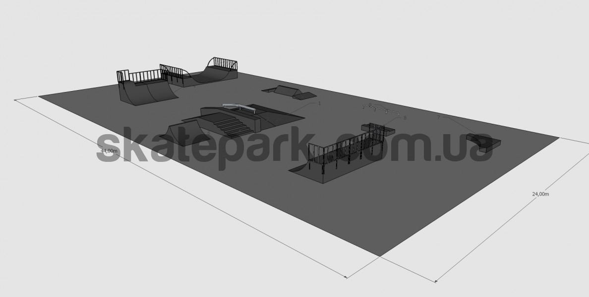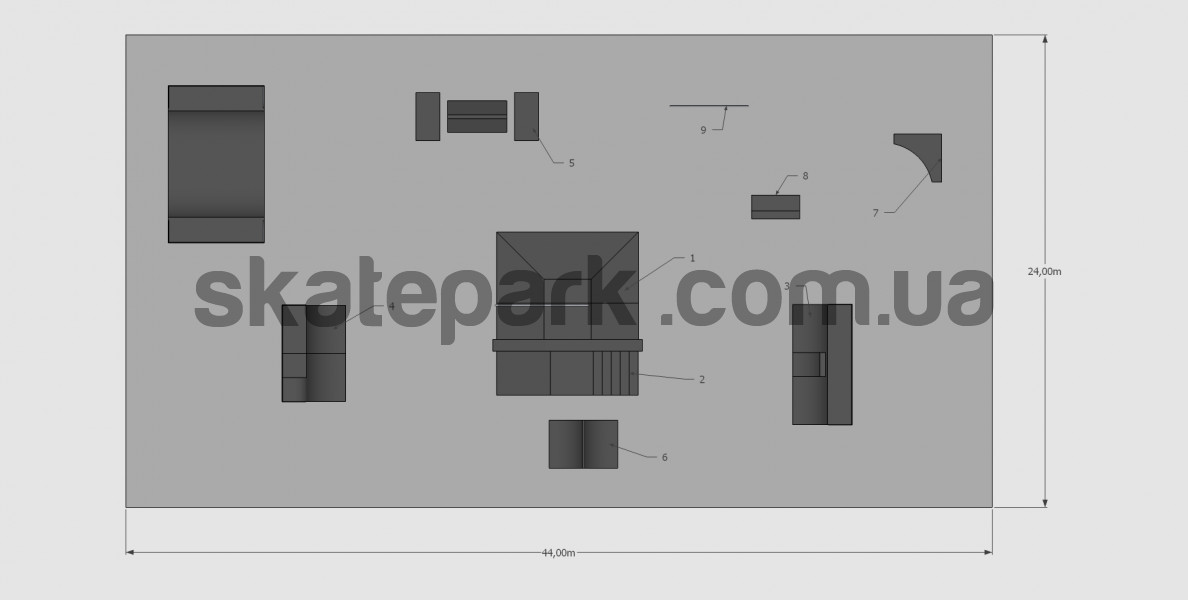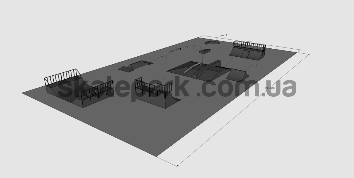 Funbox z poręczą 2/3 + funbox piramida, Funbox ze schodami z murkiem2/3-1/3prosty, Quarter pipe + mini quarter, Quarter pipe + roll-in, Skocznia z grindboxem, Spin, Grindbox 6, Grindbox 7, Poręcz prosta – profil O, Minirampa H100