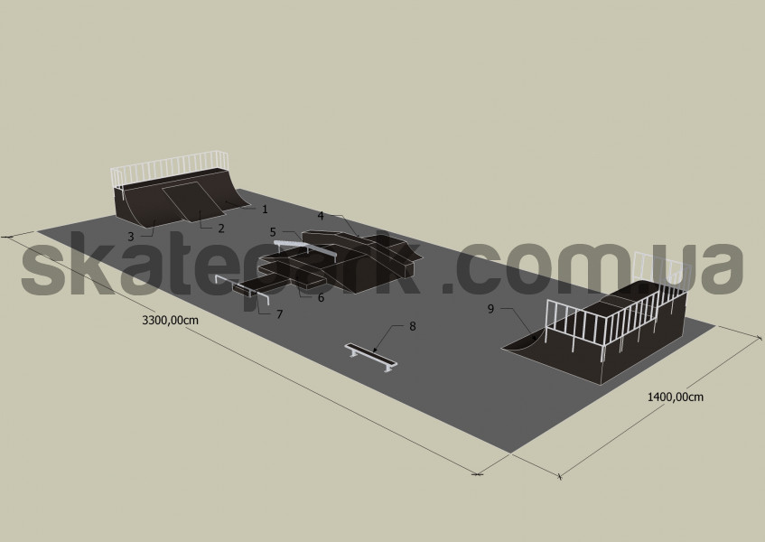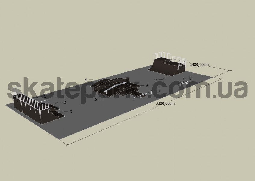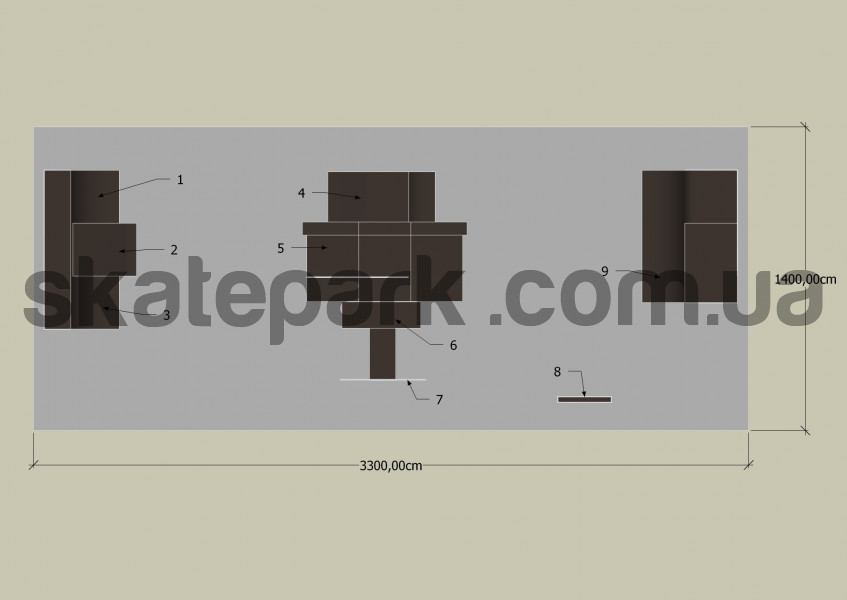 Quarter pipe, Bank ramp, Quarter pipe, Funbox do skoków, Funbox z grindboxem 3/3 + poręcz 2/3, Grindbox 1, Poręcz prosta – porfil O, Ławka 1, Quarter pipe + roll-in