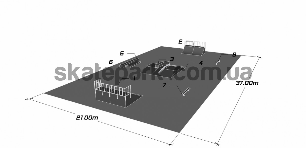 Bank Ramp, Quarter Pipe, Funbox z grindboxem 2/3, Funbox z poręczą 2/3, Grindbox 2, Grindbox 1, Ławka 1 , Poręcz prosta