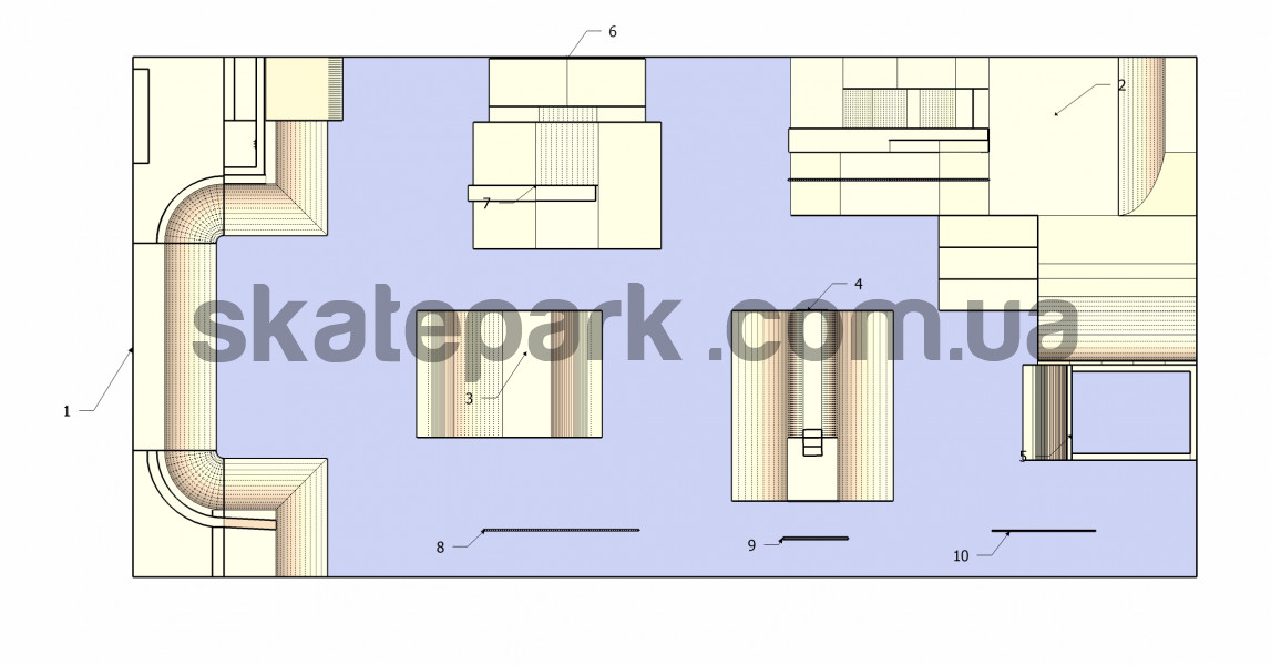 Przykładowy projekt skateparku umieszczonego w hali. Różnorodne i rozbudowane elementy przyciągną młodych skaterów.