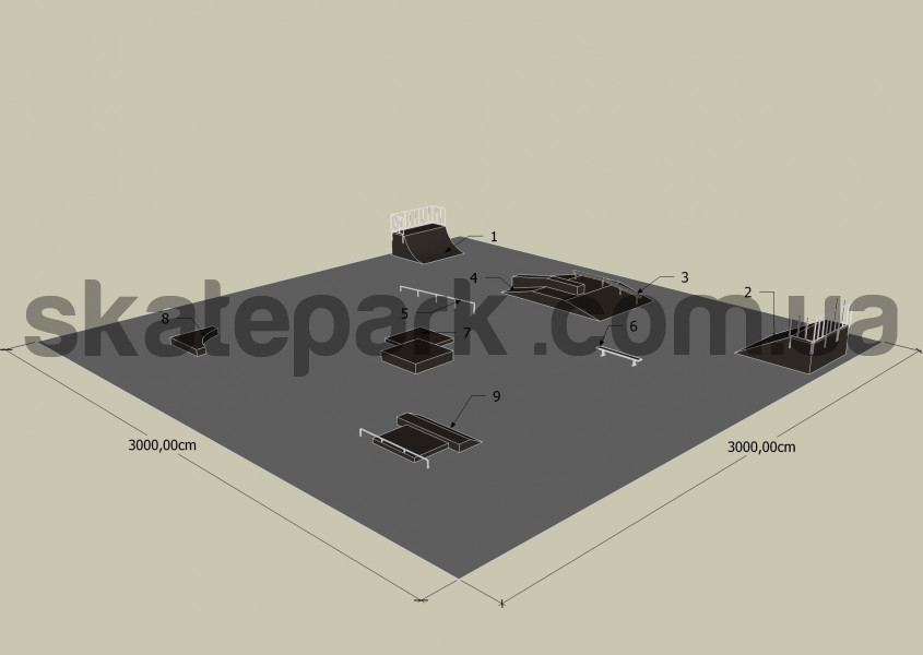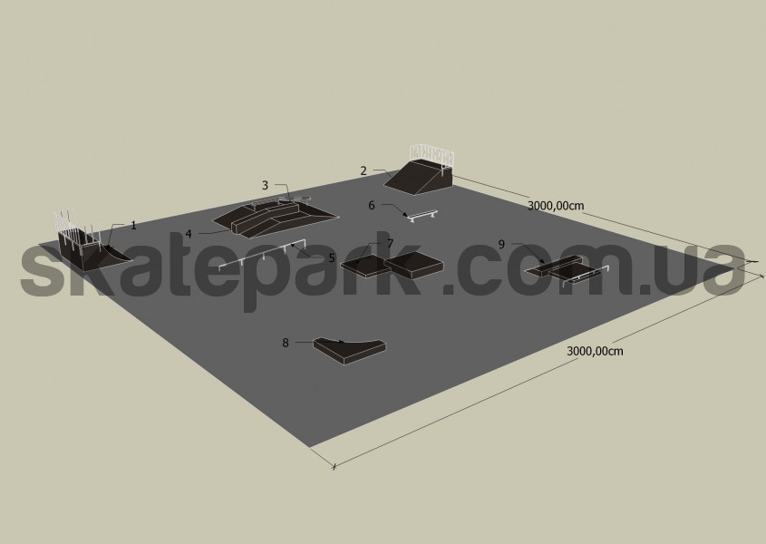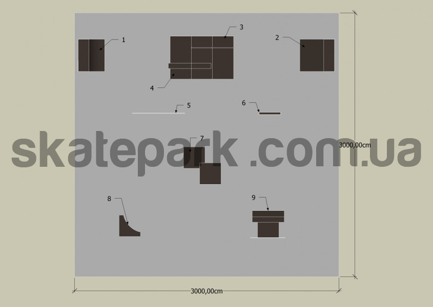 Quarter pipe, Bank ramp, Funbox z poręczą 2/3, Funbox z grindboxem 2/3, Flat handrail – profile O, Bench 1 Grindbox 3, Grindbox 6, Grindbox 9 + grindbox 1 + flat handrail profile O