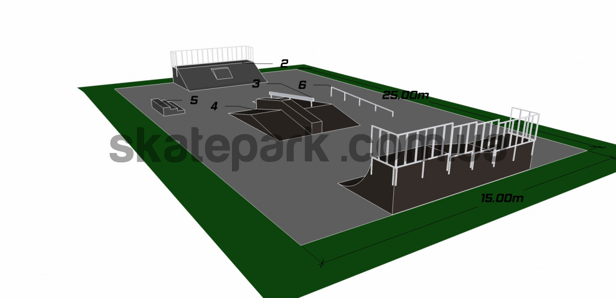Przykładowy projekt skateparku rozstawionego na dość małym placu. Projekt ten skierowany jest głównie do rolkarzy, długie grindboxy projektowane w taki sposób aby prosto z pochyłych podjazdów naskakiwać na przeszkody.