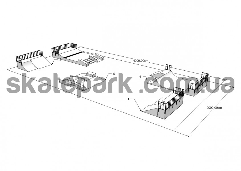 Quarter Pipe + Bank ramp, Bank Ramp + Quarter Pipe, Platforma z murkami, poręczą i schodami, Minirampa +Bank ramp + Quarter Pipe, Funbox z grindboxem 3/3, Funbox z poręczą i grindboxem 3/1,