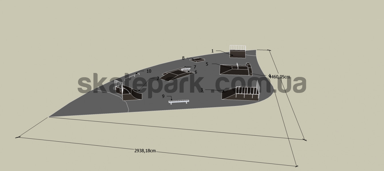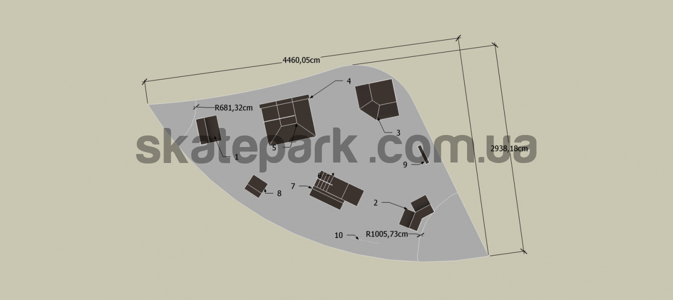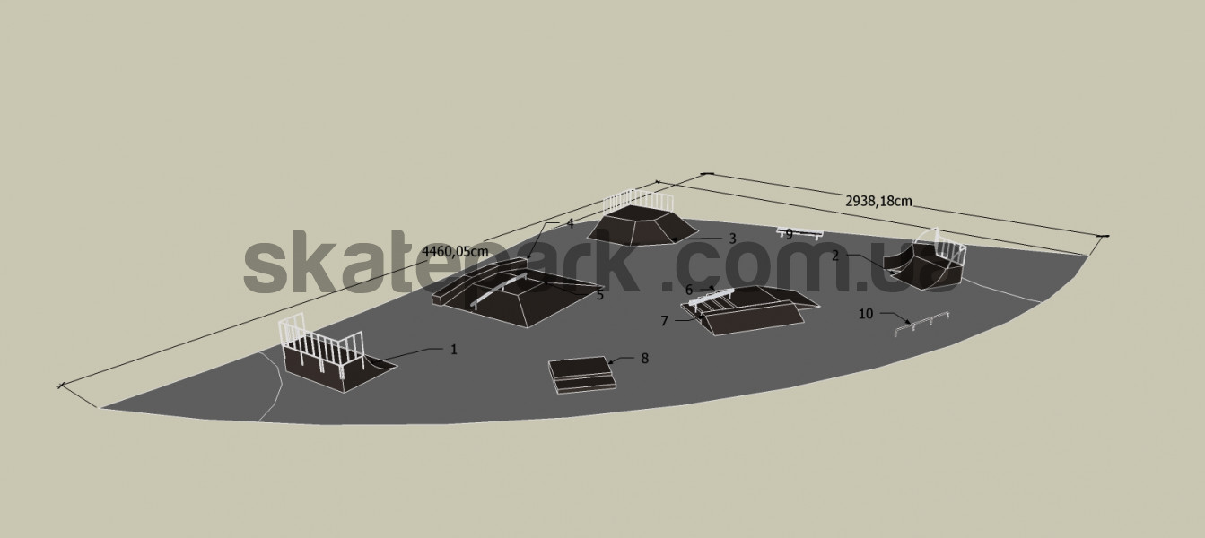 Quarter pipe, Quarter pipe, 3x Bank ramp, Funbox z grindboxem 3/3, Funbox piramida 2 z poręczą 2/3, Funbox ze schodami z poręczą 1/3, Grindbox 9, Ławka 4, Poręcz prosta - profil O