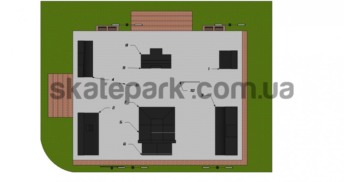 Bank ramp, Bank ramp + mini quarter, Quarter pipe + roll-in, Quarter pipe dwa poziomy, Funbox z grindboxem 3/3, Funbox z poręczą, Funbox Piramida, Grindbox , Grindbox 14, Poręcz prosta - profil [], Pole Jam