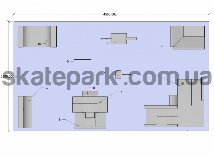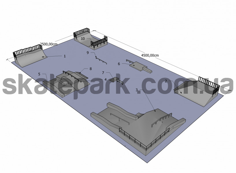 Quarter pipe dwa poziomy, 2x Bank ramp 90st piramida, Plaforma, Funbox (podest 366) z poręczą 2/3, Funbox (podest 244) z disaser boxem + rurka i manualbox, Grindbox 10, Skocznia z barierką, Grindbox 9, Poręcz prosta - profil O, Minirampa H120