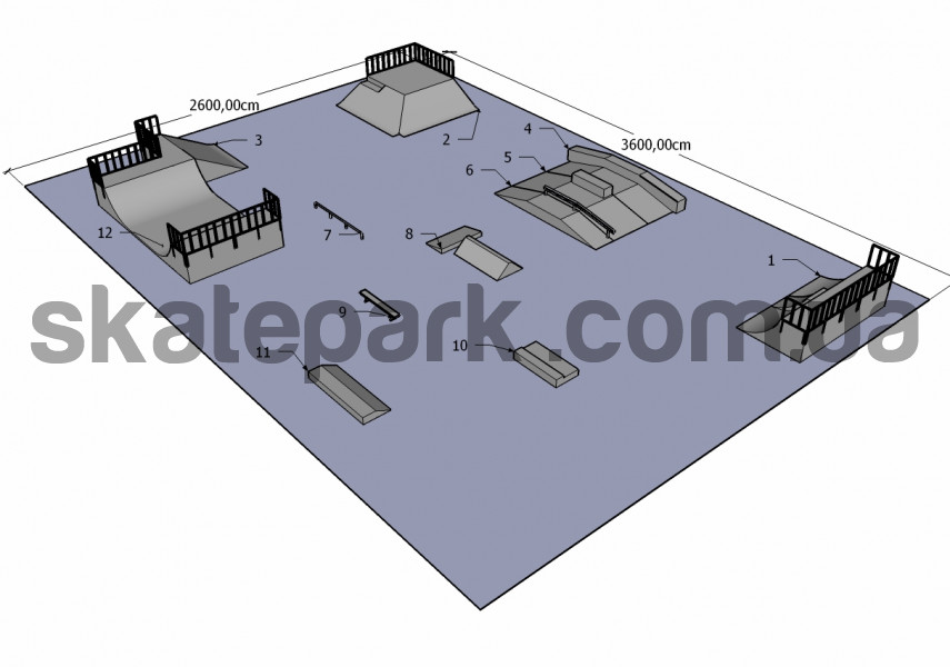 Quarter pipe + mini quarter, 2x Bank ramp 90st piramida + london gap, Bank ramp, Funbox with grindbox 3/3, Funbox with grindbox 3/1, Funbox with rail 2/3, Grind rail, Kicker + grindbox, Grind banch, Grindbox 7, Grindbox 9,