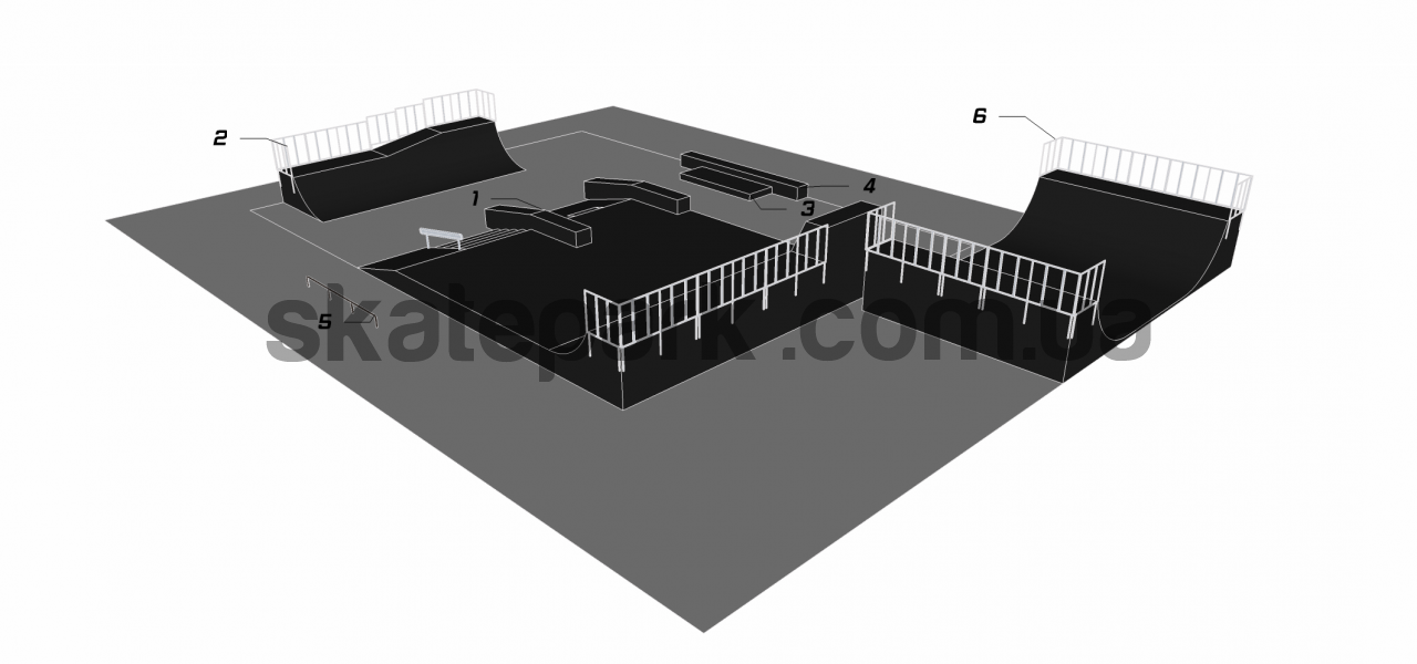 Platform, Quarter pipe two levels, Grindbox 1, Grindbox 2, Grindrail, Miniramp