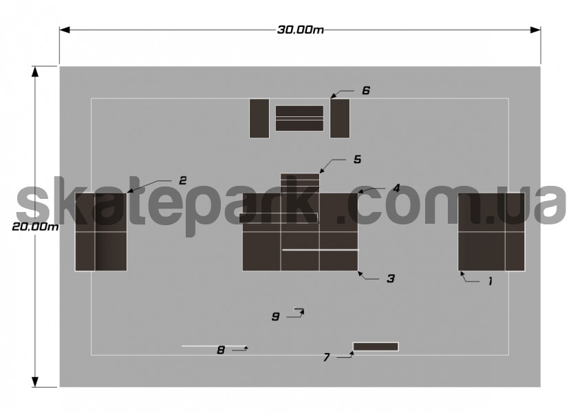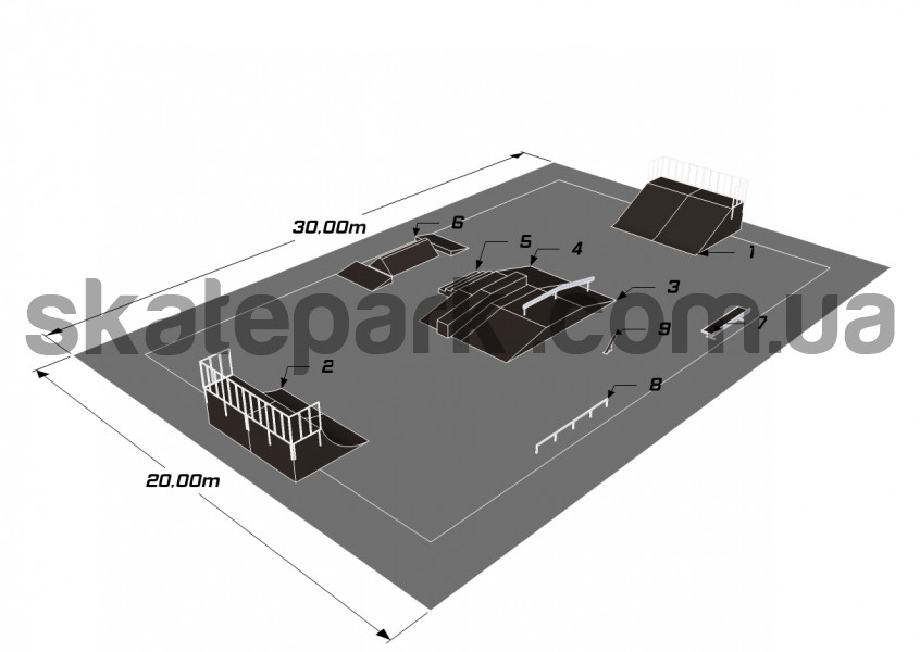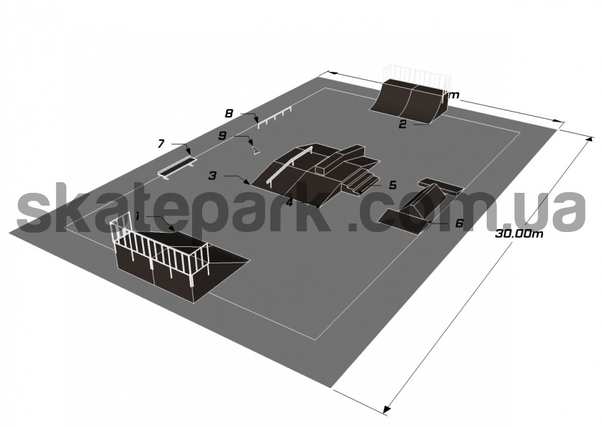 Bank ramp, Quarter pipe, Funbox z poręczą 2/3, Funbox z grindboxem 2/3, Grindbox 8, Skocznia z grindboxem, Ławka 4, Poręcz prosta – profil O, Polljam