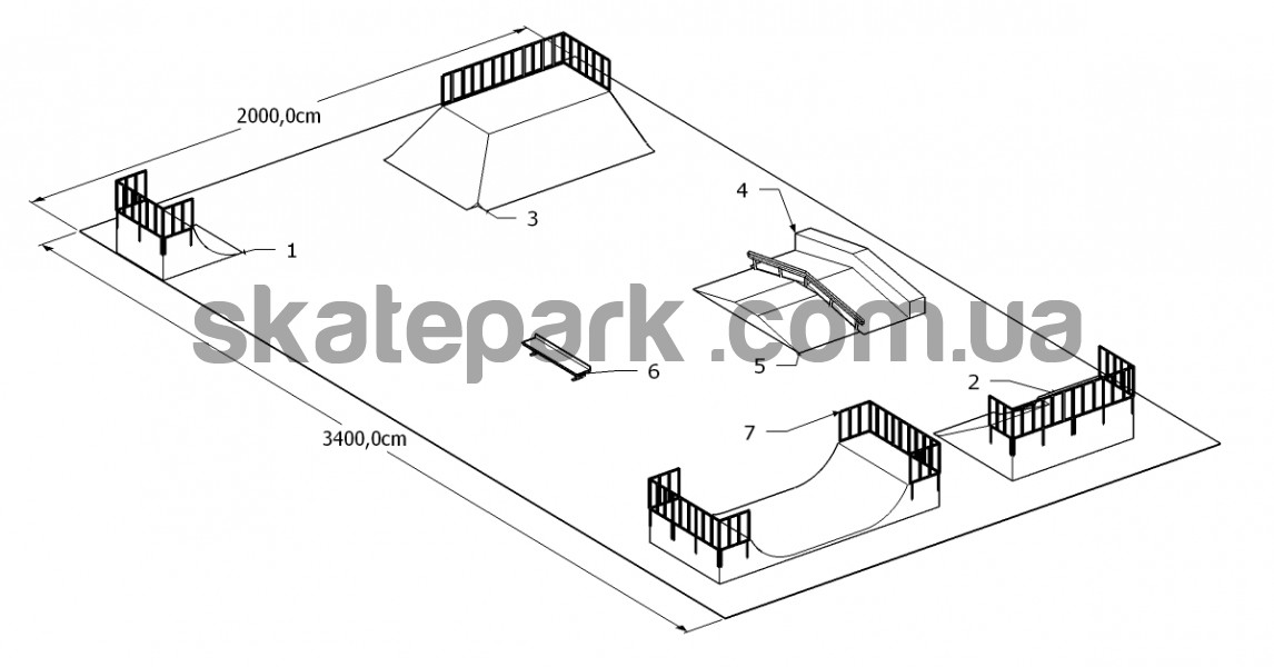 Quarter pipe, Quarter pipe + Bank ramp, 2x Bank Ramp 90st, Funbox z grindboxem i poręczą, Funbox (podest 122), Ławka 4, Minirampa H120