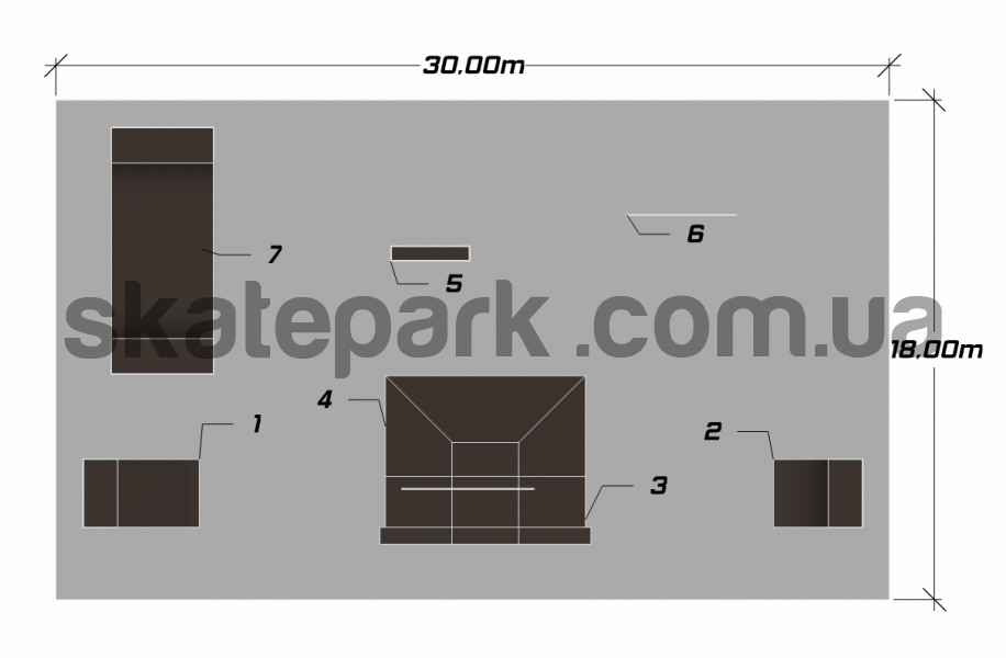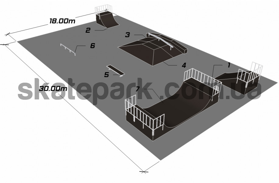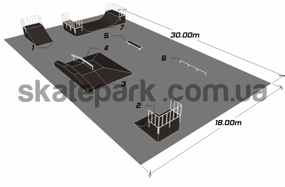 Bank ramp, Quarter pipe, Funbox z grindboxem 3/3 i poręczą 2/3, Funbox piramida 2, Ławka 2, Poręcz prosta, Minirampa
