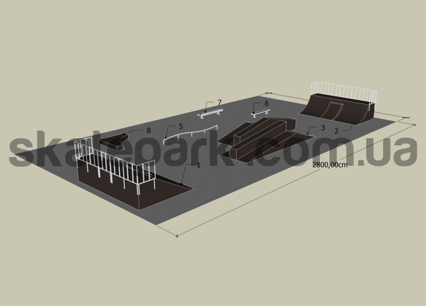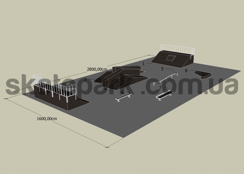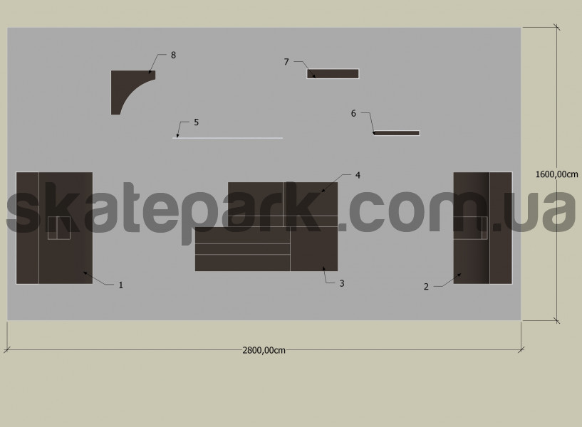 Bank ramp + mini quarter, Quarter pipe + mini quarter, Funbox z longboxem, Funbox z disaster boxem, Poręcz „fala” – profil O, Ławka 1, Ławka 4, Grindbox 6,