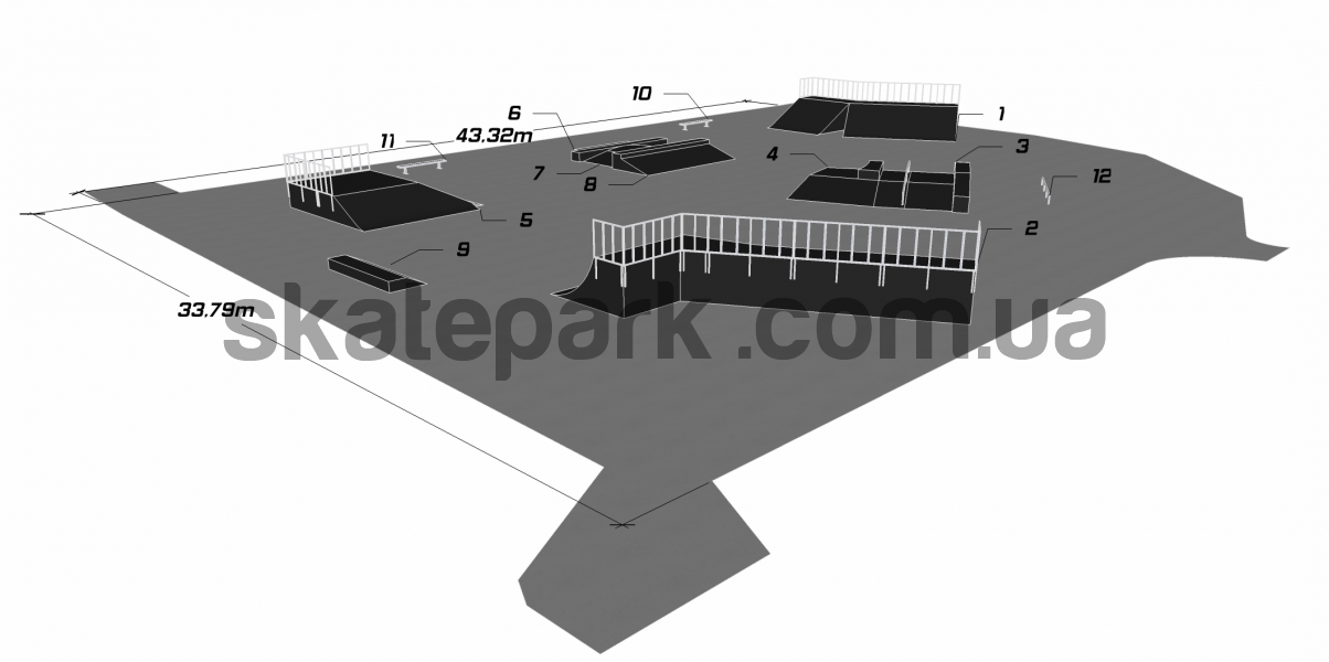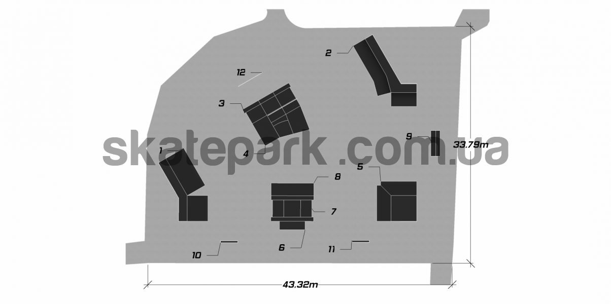 2x Bank ramp 30st, Quarter pipe, Funbox z grindboxem 3/3 + poręcz 2/3, Funbox z grindboxem 3/1, 2x Bank ramp 90st piramida, Grindbox 1 + Grindbox 2, Funbox fala (podest 122), Grindbox 12, Grindbox 9, Ławka 1, Ławka 1, Poręcz prosta