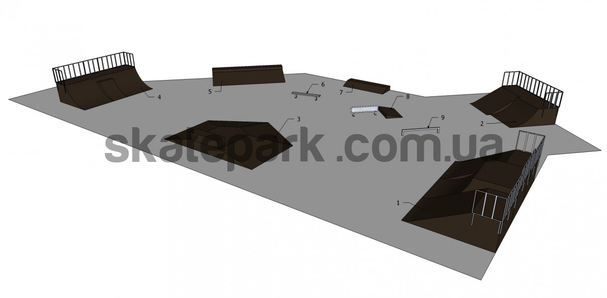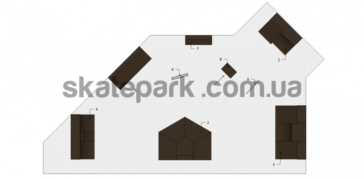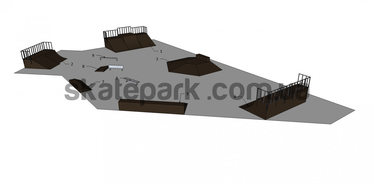 2x Bank ramp + Quarter pipe, Bank ramp + quarter pipe, Funbox piramida 1 + grindbox 3/1, Quarter pipe + mini quarter, Grindbox 12, Ławka 1, Grindbox 9, Skocznia z barierką, Poręcz prosta mała- profil[]