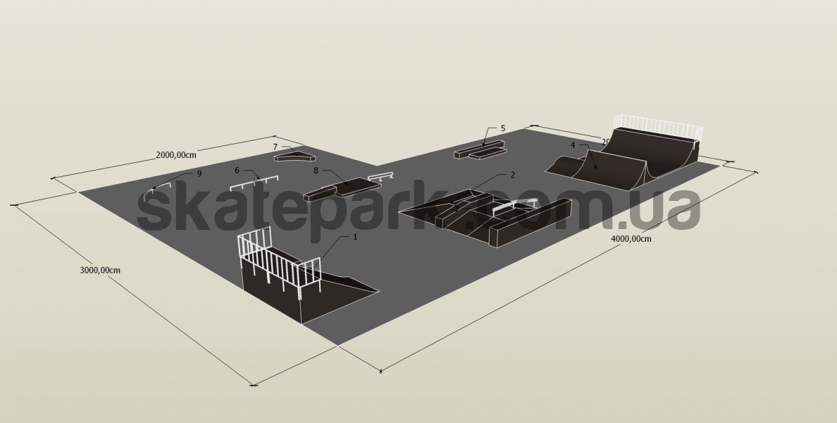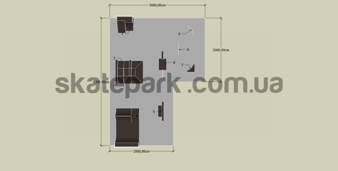 Quarter pipe + Bank ramp, Funbox piramida 2 + funbox z grindboxem 2/3, Funbox z grindboxem prostym + poręcz 2/3, Minirampa H180, Grindbox 1 + Grindbox 2, Poręcz prosta – profil[], Grindbox 6, Grindbox 10, Poręcz „C” – profil O