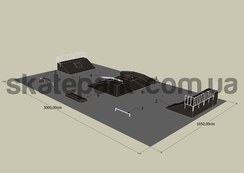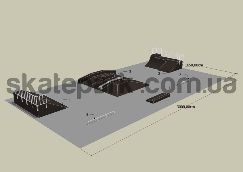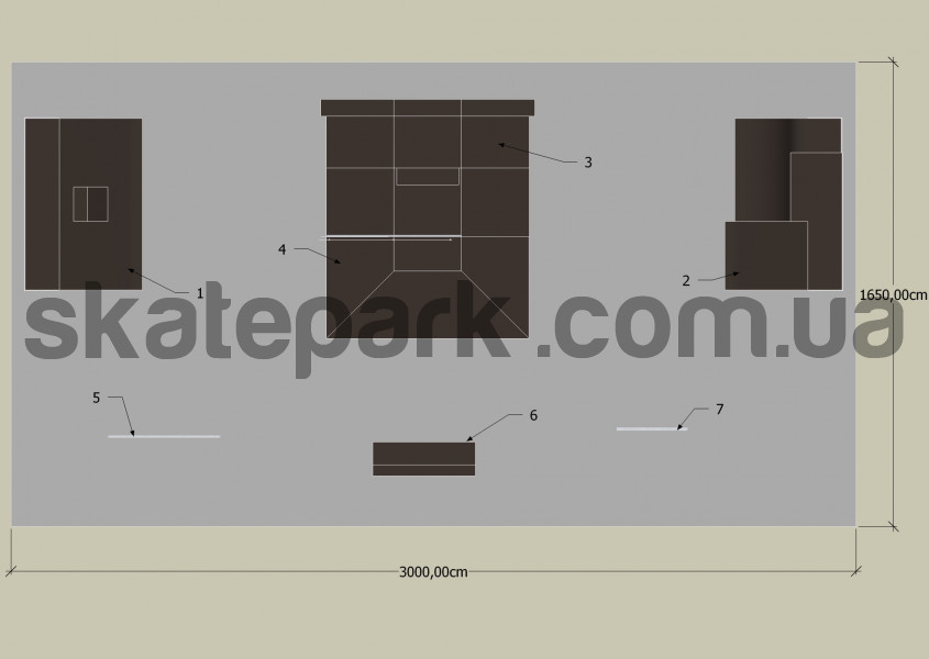 Bank ramp + mini quarter, Quarter pipe + Bank ramp + roll-in, Funbox z grindboxem 3/3 + grindbox 3/1, Funbox piramida 2 + poręcz 2/3, Poręcz prosta – profil O, Grindbox 7, Poręcz prosta mała – profil []