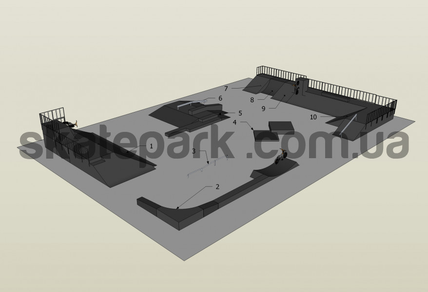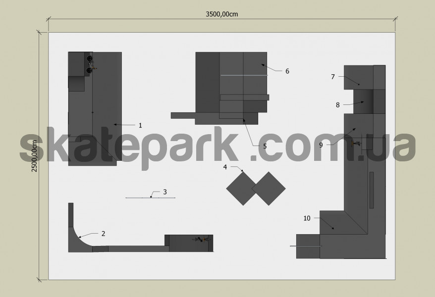 2x Bank ramp 90st piramida, Bank ramp + Wall ride, Grindbox, Grindbox 3, Grindbox, Funbox z grindboxem 2/3 + Poręcz 2/3, Bank ramp, Quarter pipe, Bank ramp, Korner z poręczą, z sub boxem + Wall ride