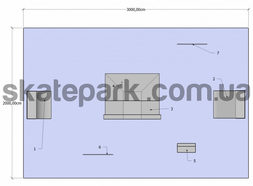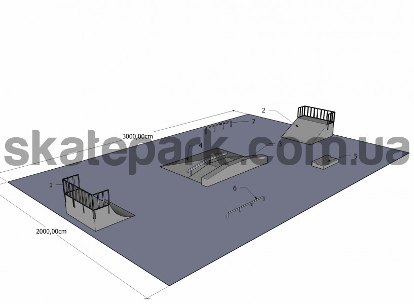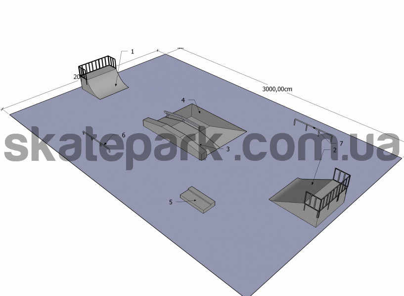 Quarter pipe, Bank ramp, Funbox z grindboxem 3/3, Piramida 2 + poręcz 2/3, Grindbox 7, Poręcz prosta – profil O, Poręcz prosta – profil O