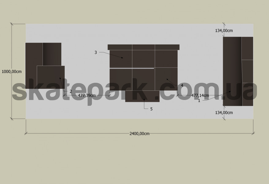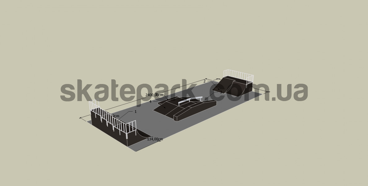 Quarter pipe dwa poziomy, Quarter pipe + Bank ramp, Funbox z grindboxem 3/3, Funbox z poręczą 2/3, Grindbox 1