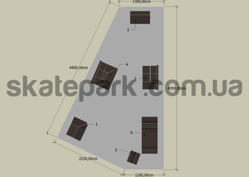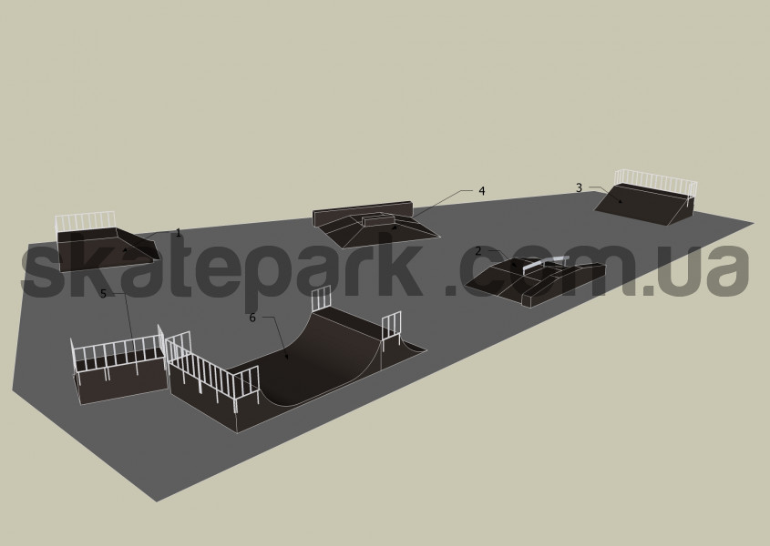 2x Bank ramp 90st piramida, Funbox z grindboxem 3/3 +poręcz 2/3, Bank ramp, Funbox z boxem prostym + piramida z grindboxem 3/1, Quarter pipe, Minirampa H150 + quarter pipe