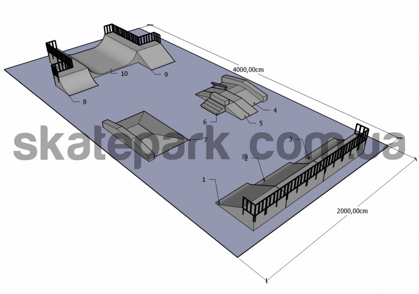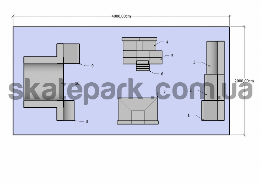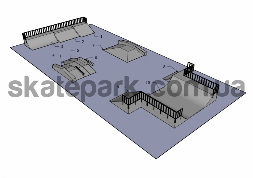 Bank Ramp, Bank ramp, Quarter Pipe, Funbox z disaster boxem, Funbox z grindboxem 3/1 +poręcz 1/3, Grindbox 8, Funbox piramida z grindboxem 3/3, Quarter pipe , Bank ramp, Minirampa H150