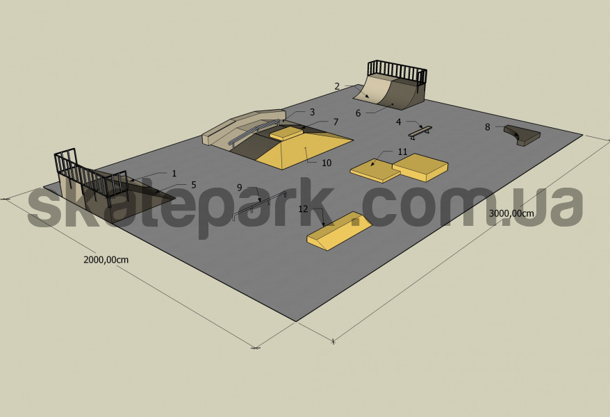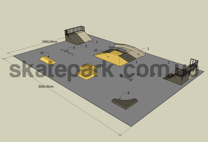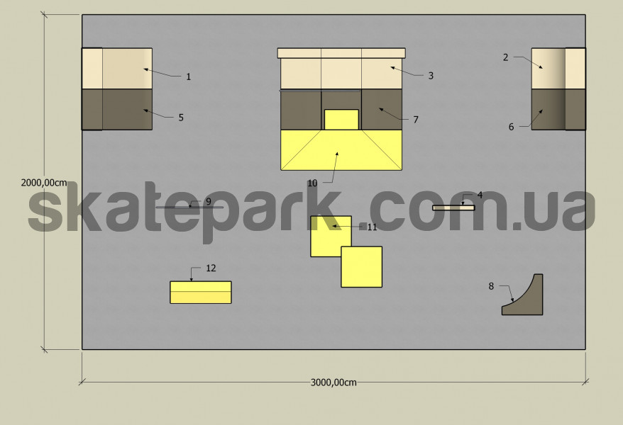 Bank ramp, Quarter pipe, Funbox z grindboxem 3/3, Ławka 1, Bank ramp, Quarter pipe, Funbox z poręczą 2/3, Grindbox 6, Poręcz prosta – profil O, Funbox piramida 2 + manual pad, Grindbox 3, Grindbox 9