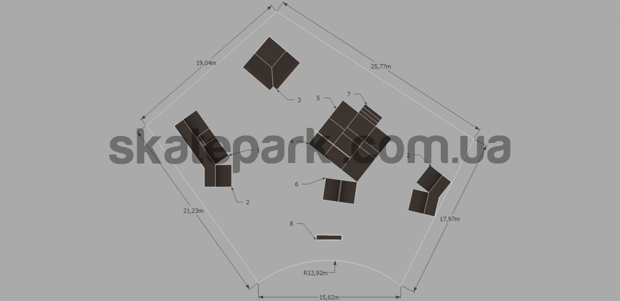 Quarter pipe + mini quarter, Quarter pipe, 2x Bank ramp 90st piramida, Funbox z poręczą 2/3, Funbox grindboxem 2/3, Spin, Grindbox 8, Ławeczka 4