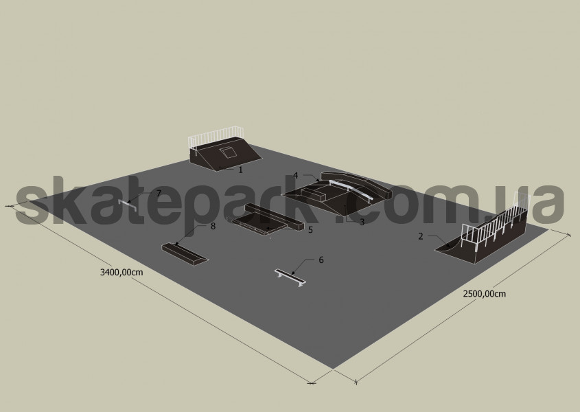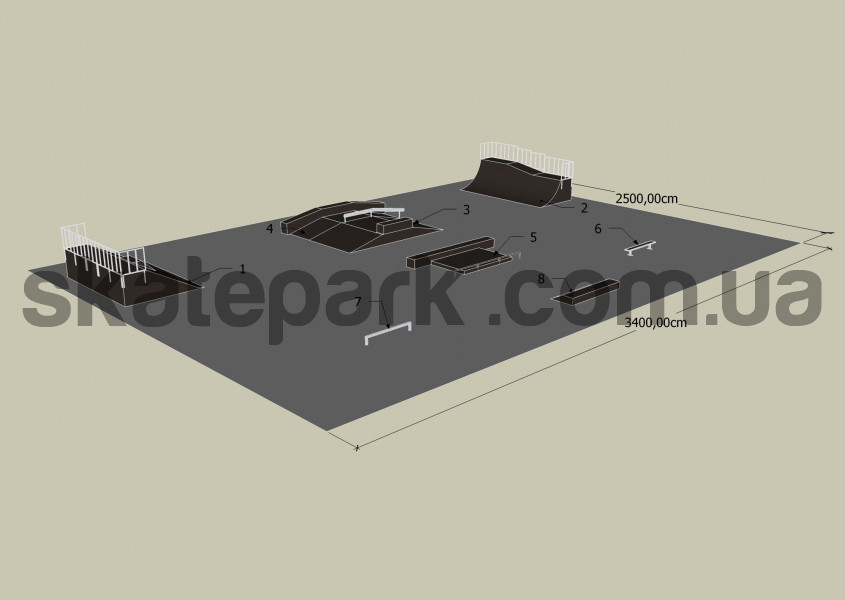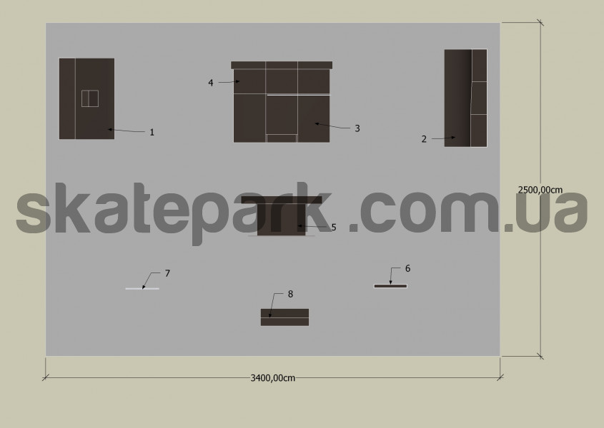 Bank ramp + mini quarter, Quarter pipe dwa poziomy, Funbox z grindboxem 3/1 + poęcz 2/3, Funbox z grindboxem 3/3, Grindbox 1 + grndbox 2 + Poręcz płaska – profil O, Ławka 1, Poręcz prosta mała – profil [], Grindbox 9